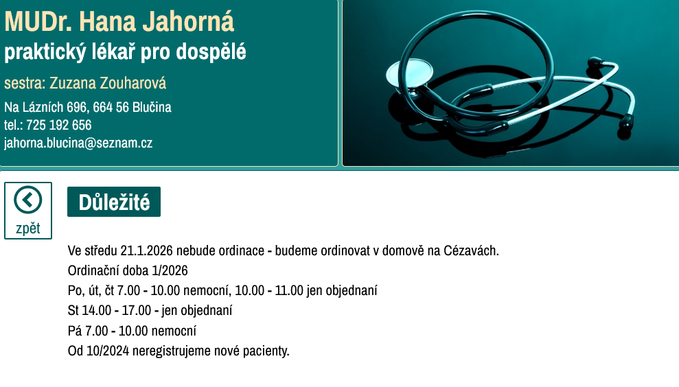 MUDr. Jahorná nebude ordinovat ve středu 21.1.2026 v Blučině.