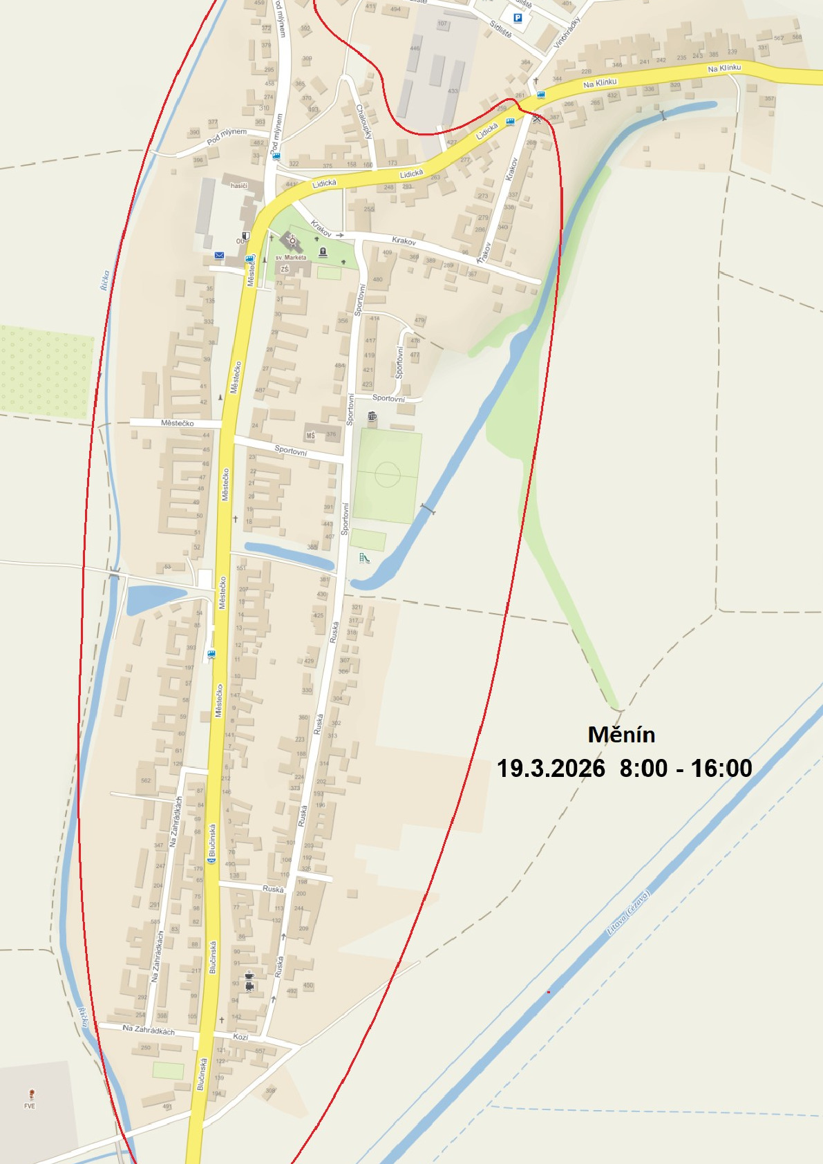 Měnín - Městečko, - Lidická od kostela po křižovatku s ul. Krakov čp. 260 a 444, - ul. Krakov, - Chaloupky, - Pod Mlýnem, - Sportovní, - Ruská, - Blučinská, - Na Zahrádkách, - Kozí,