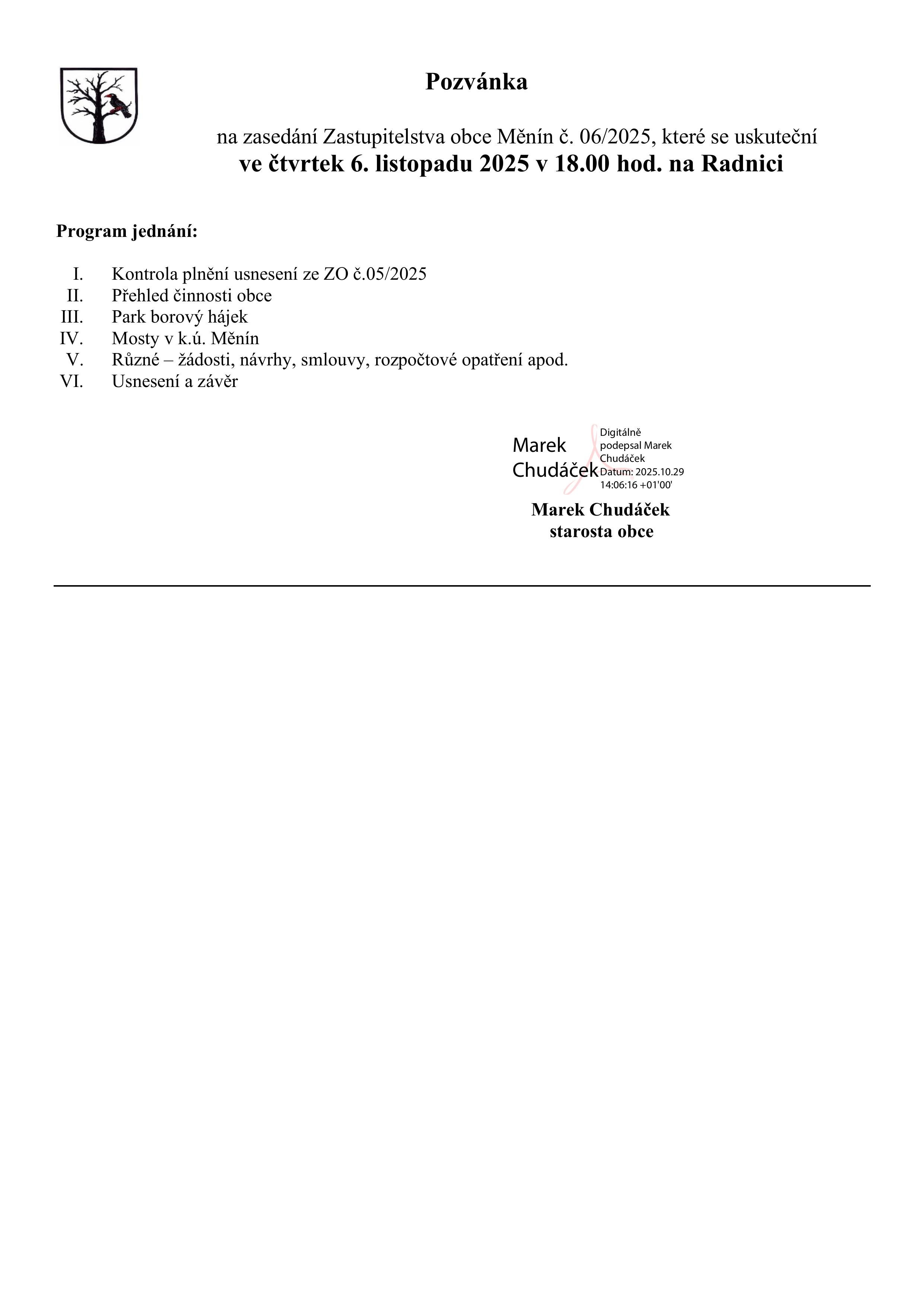 Zasedání Zastupitelstva obce Měnín se uskuteční ve čvrtek 6. listopadu 2025 v 18:00 na radnici.