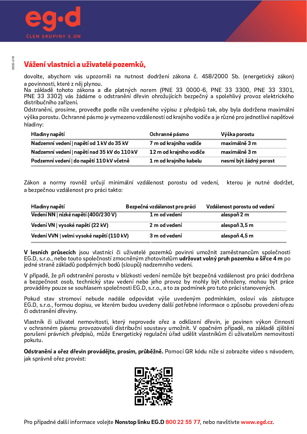 V souladu s ustanovením § 25 odst. 3 písm. g) zákona č. 458/2000 Sb., energetického zákona, ve znění pozdějších předpisů, informujeme občany o nezbytných opatřeních souvisejících se zařízeními distribuční soustavy umístěnými na jejich pozemcích.