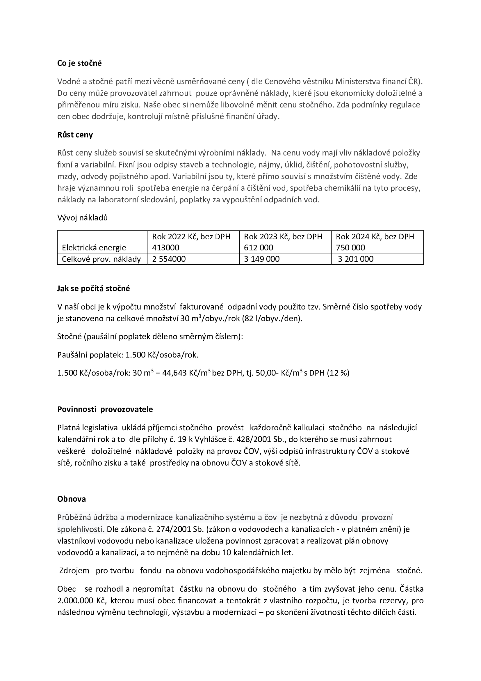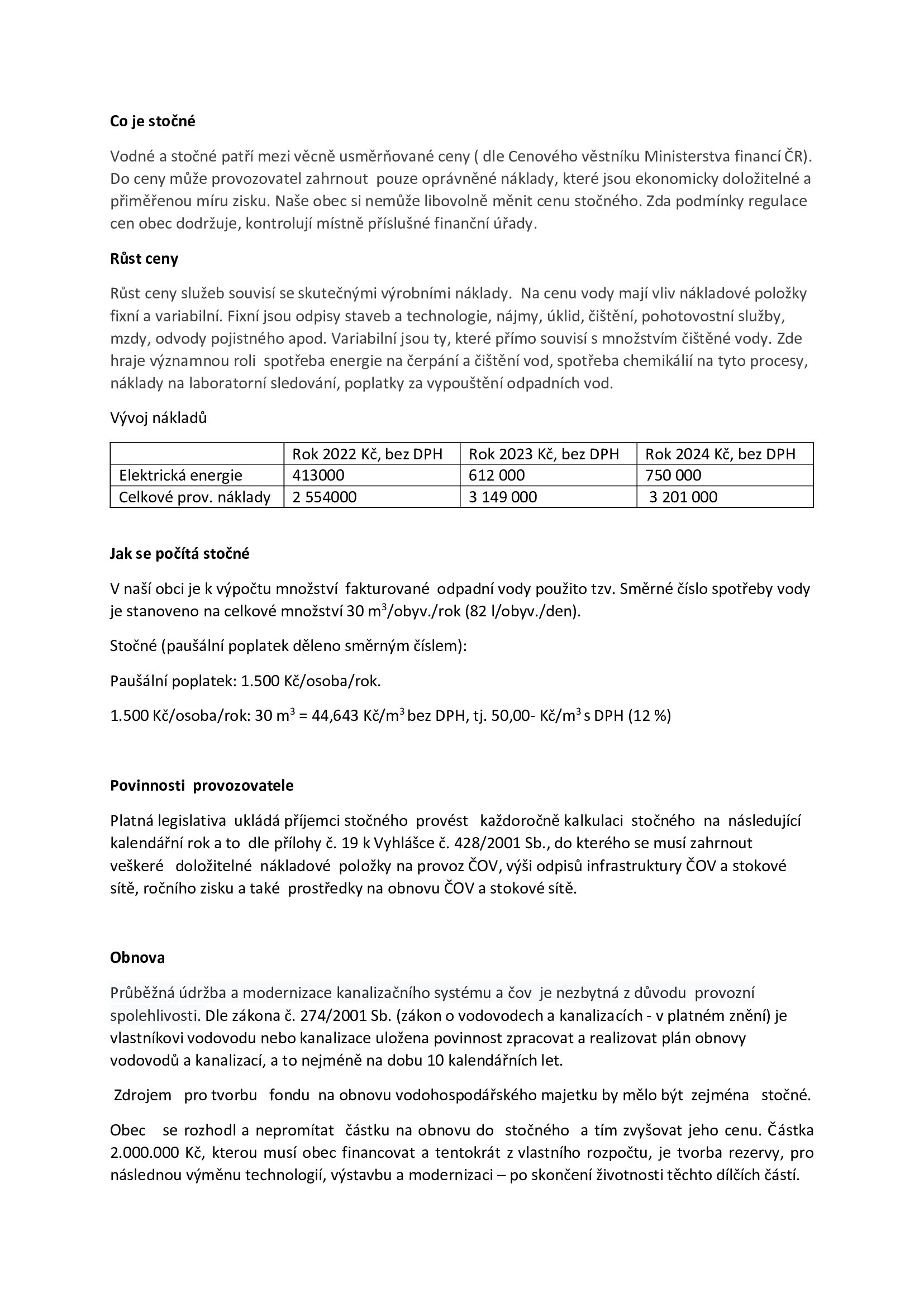 V loňském roce Zastupitelstvo obce schválilo výši stočného na rok 2025 ve výši 1500 Kč za osobu a rok. Víme, že je to prudké navýšení a může to způsobit komplikace. Každý rok se zvedají náklady na provoz a nároky na kvalitu vyčištěné vody. Bylo nutné cenu zvýšit a hlavně ji narovnat, protože léta byla cena stočného velmi nízká a obec provoz dotovala z obecního rozpočtu. Obec se musí chovat jako správný hospodář a provoz nesmí být výdělečný ani ztrátový. Zákonem je určené také stanovení ceny a jsou na to přesné výpočty. Obec se vydala tou nejlepší cestou pro občany. Kdyby obec vstoupila do Svazu Šlapanicko, cena vodného a stočného by činila 142 Kč za m3. Ve stočném by byla cena 2190 kč za osobu na rok a obec by další navýšení nemohla ovlivnit. Uvědumejeme si, že úřední desku, kde visí návrh stočného moc lidí nečte a mohlo to být lépe komunikováno. Tímto se omlouváme. V tomto roce již nebude možné částku dělit, ale na příští rok budete moci zaplatit stočné např. ve dvou splátkách. Cena na příští rok bude stejná. V přílohách se můžete dočíst, co je stočné, náklady a výpočet stočného.