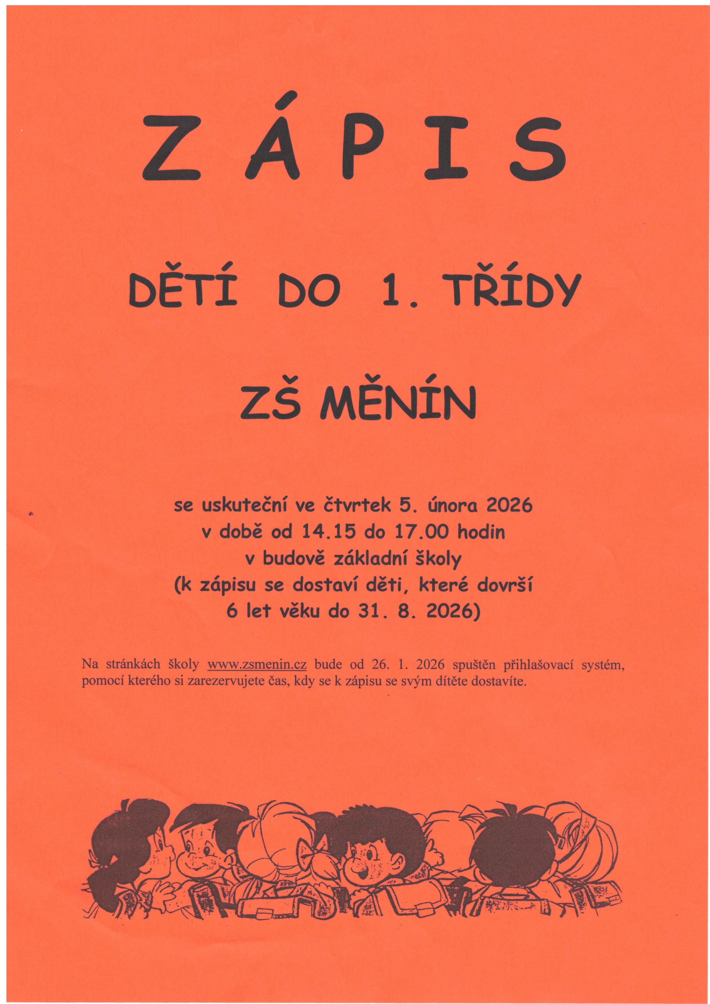 ZŠ Měnín informuje, že zápis dětí do 1. třídy se uskuteční ve čtvrtek 5. února 2026 v době od 14:15 do 17:00 v budově základní školy.