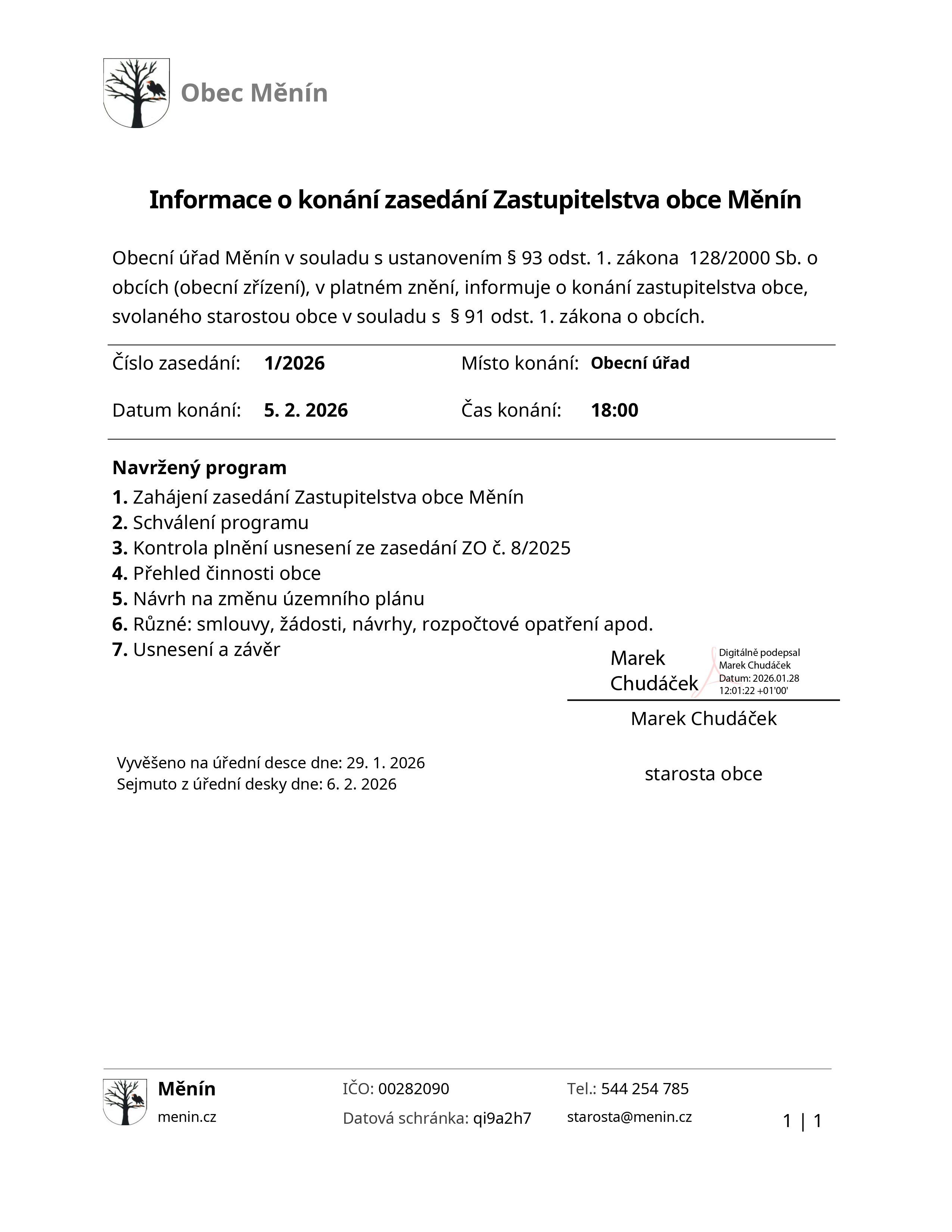Zasedání Zastupitelstva obce Měnín č. 1/2026