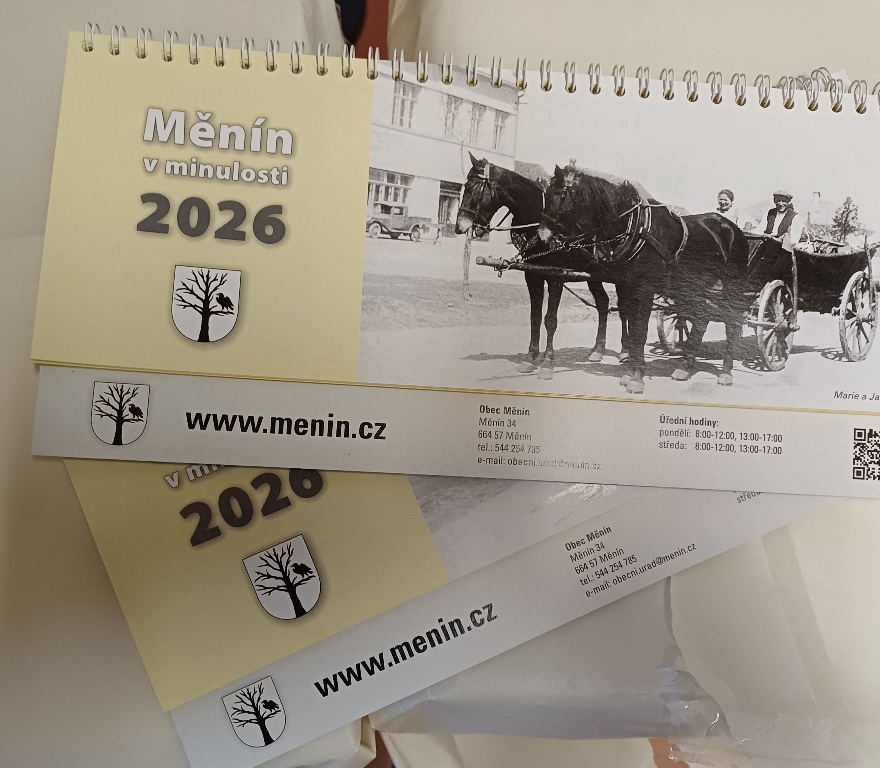 Kalendář na rok 2026 "Měnín v minulosti" je na světě. Brzy bude k dostání na poště, obecním úřadě a v neděli na rozsvícení vánočního stromu v parku za kostelem.